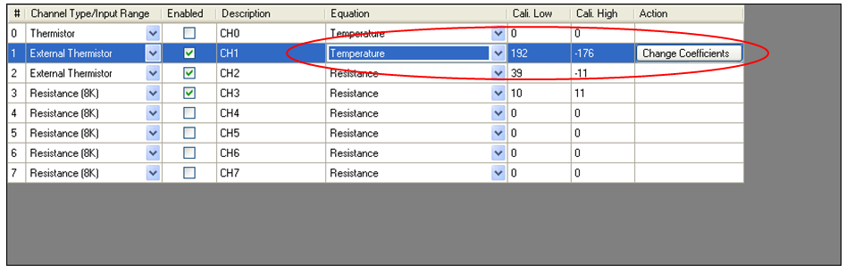 Thermistor, "Change Coefficients" button will display in "Action" column to